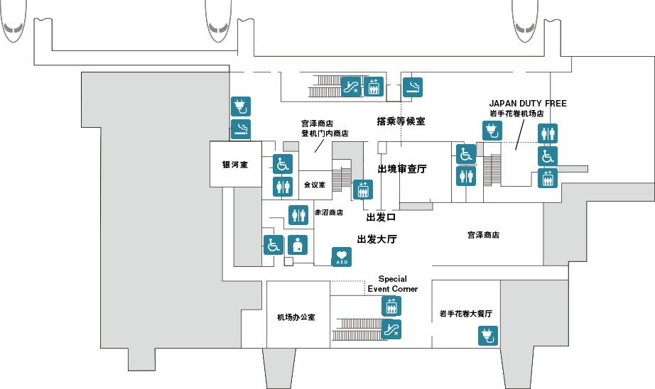 楼层地图 1F登机手续办理大厅、到达大厅、商店 国際線チェックインカウンター FDAカウンター JALカウンター レンタカー 空港ビル直営店 hana AIRPORT SHOP&CAFÉ AED 救護室 授乳室 2F出发大厅(国内・国际)、餐厅、商店 宮澤商店ゲート内ショップ JAPAN DUTY FREE いわて花巻空港店 いわて花巻大食堂 宮澤商店 赤沼商店 AED オストメイト設備 3F瞭望台 电梯 自动扶梯 厕所 哺乳室 AED(自动体外除颤器) 问询台 投币式储物柜 出租车乘降处 巴士下车处 巴士乘车处 吸烟区 残障人士专用厕所 人工肛门专用厕所 医务室 电源专区